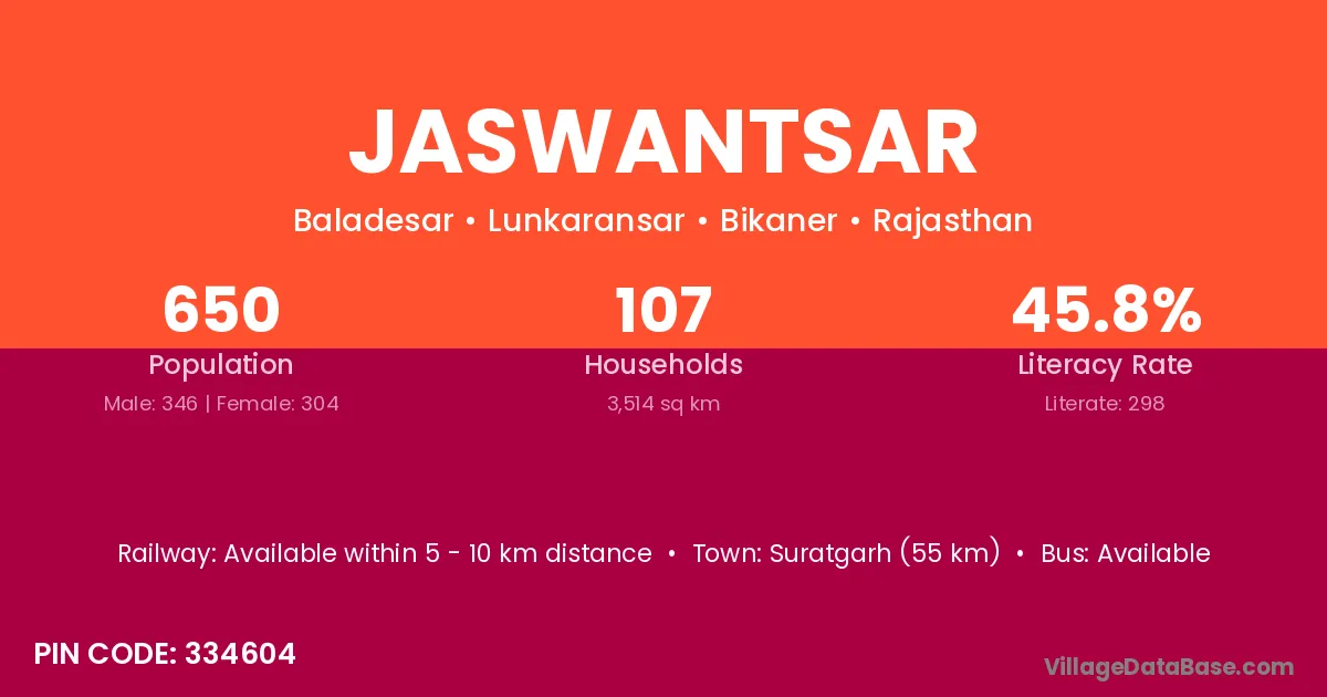 Suratgarh (55 km) is the nearest town to Jaswantsar village for major economic activities and is located approximately 55 km away.