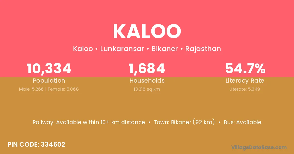 Bikaner (92 km) is the nearest town to Kaloo village for major economic activities and is located approximately 92 km away.