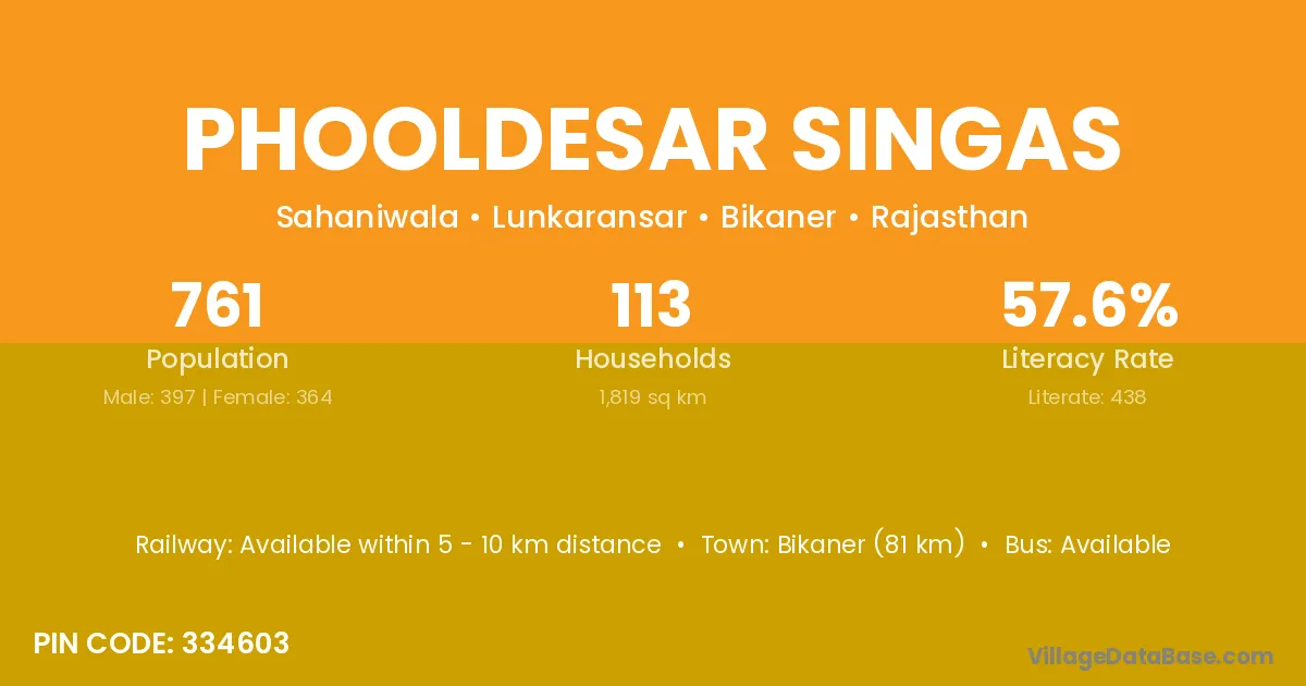 Phooldesar Singas village has a total population of 761 people, of which 397 are males and 364 are females.