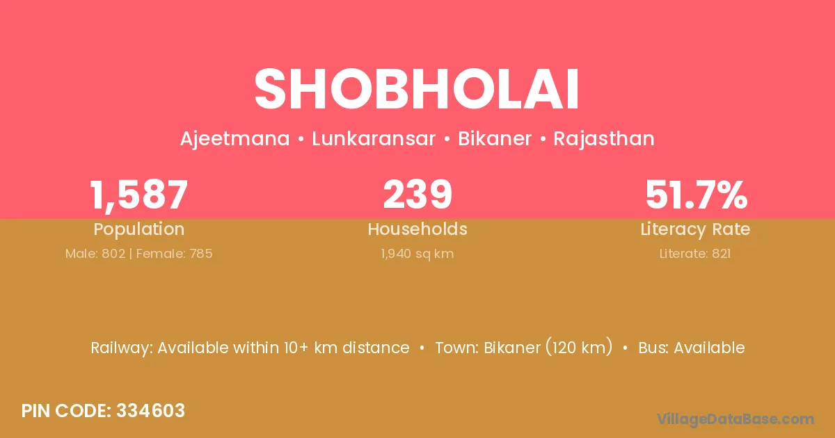 Bikaner (120 km) is the nearest town to Shobholai village for major economic activities and is located approximately 120 km away.