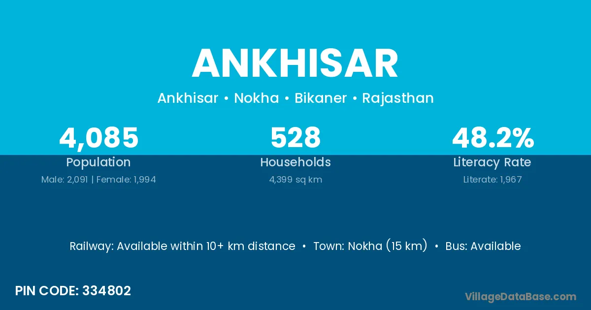 Nokha (15 km) is the nearest town to Ankhisar village for major economic activities and is located approximately 15 km away.