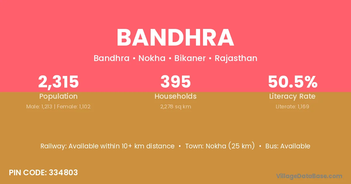 Nokha (25 km) is the nearest town to Bandhra village for major economic activities and is located approximately 25 km away.