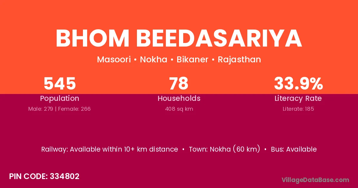 Nokha (60 km) is the nearest town to Bhom Beedasariya village for major economic activities and is located approximately 60 km away.
