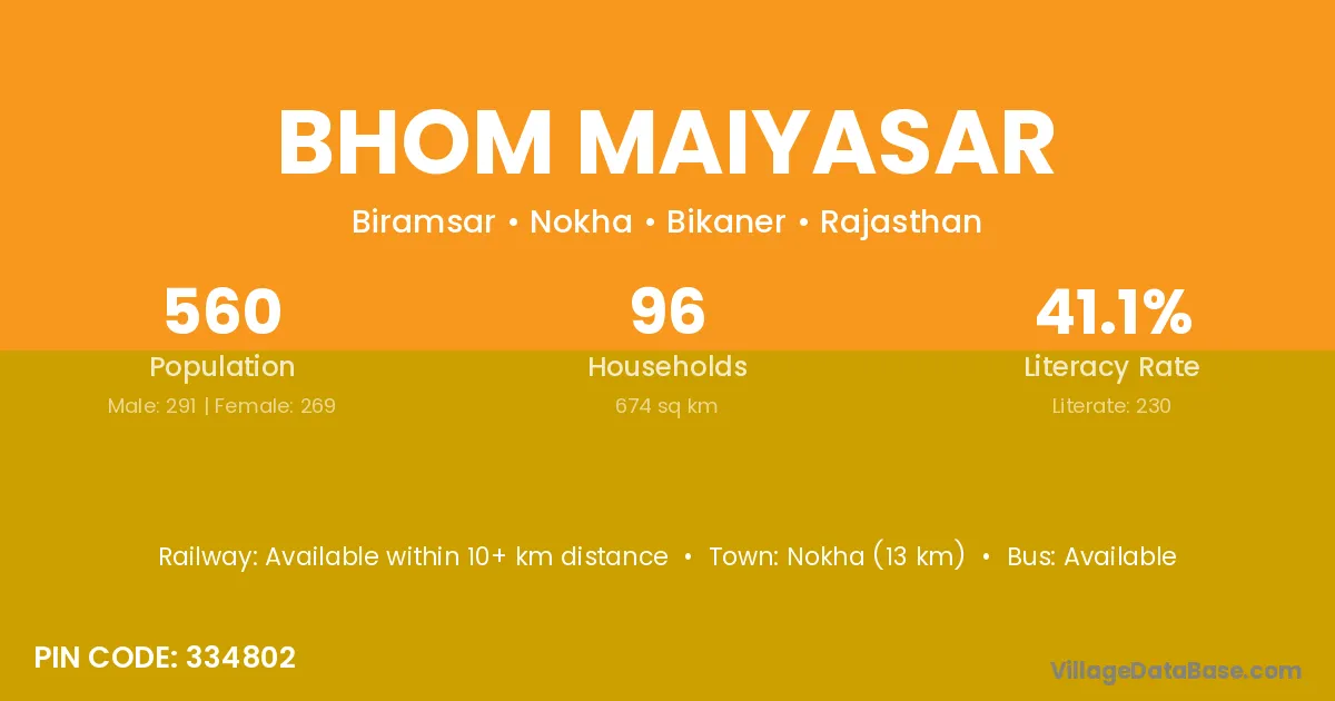 Nokha (13 km) is the nearest town to Bhom Maiyasar village for major economic activities and is located approximately 13 km away.