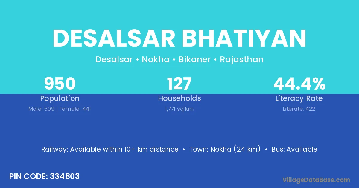 Nokha (24 km) is the nearest town to Desalsar Bhatiyan village for major economic activities and is located approximately 24 km away.