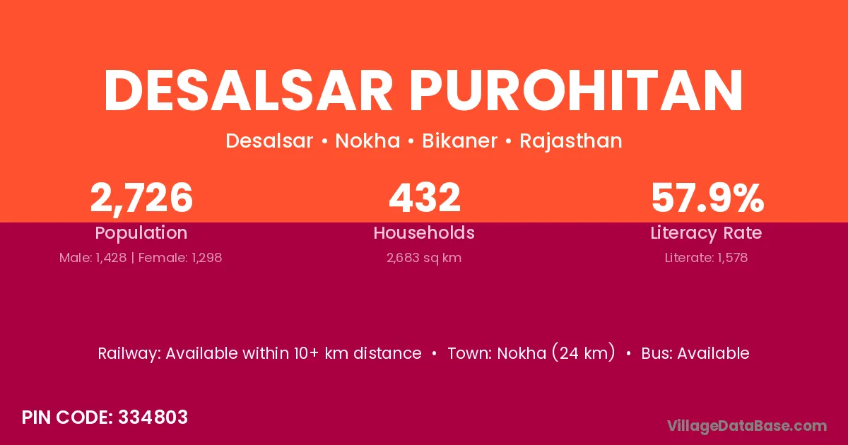 Nokha (24 km) is the nearest town to Desalsar Purohitan village for major economic activities and is located approximately 24 km away.