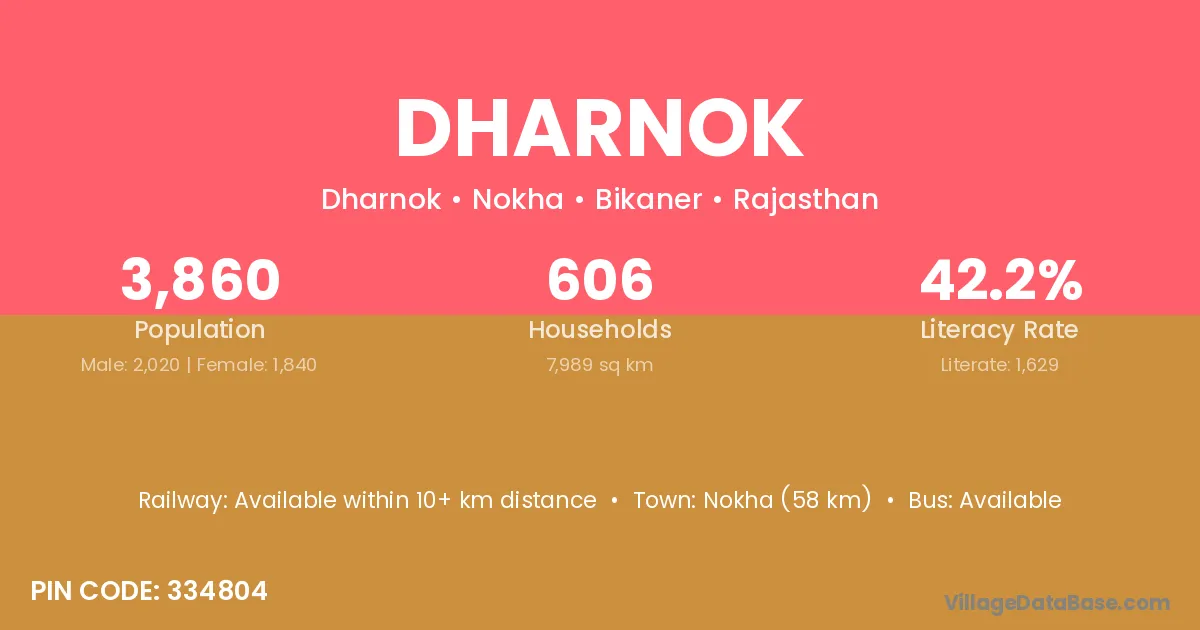 Nokha (58 km) is the nearest town to Dharnok village for major economic activities and is located approximately 58 km away.