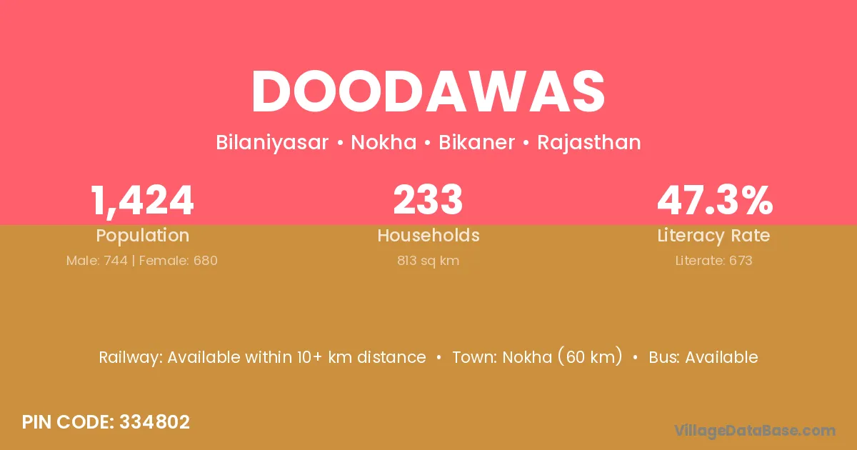 Nokha (60 km) is the nearest town to Doodawas village for major economic activities and is located approximately 60 km away.