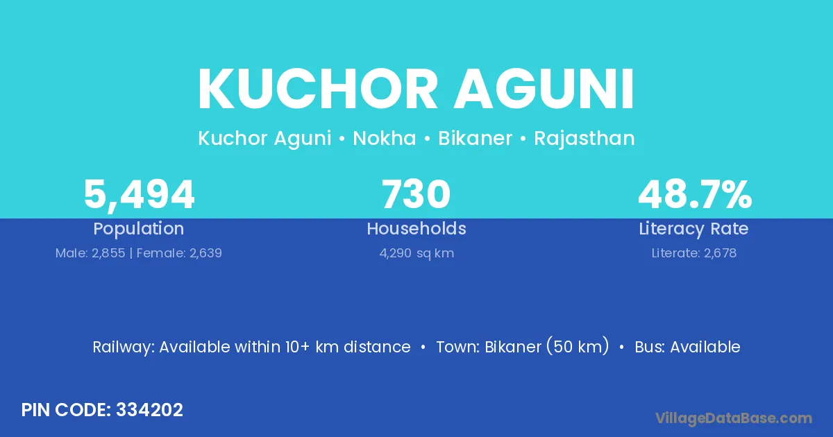 Bikaner (50 km) is the nearest town to Kuchor Aguni village for major economic activities and is located approximately 50 km away.