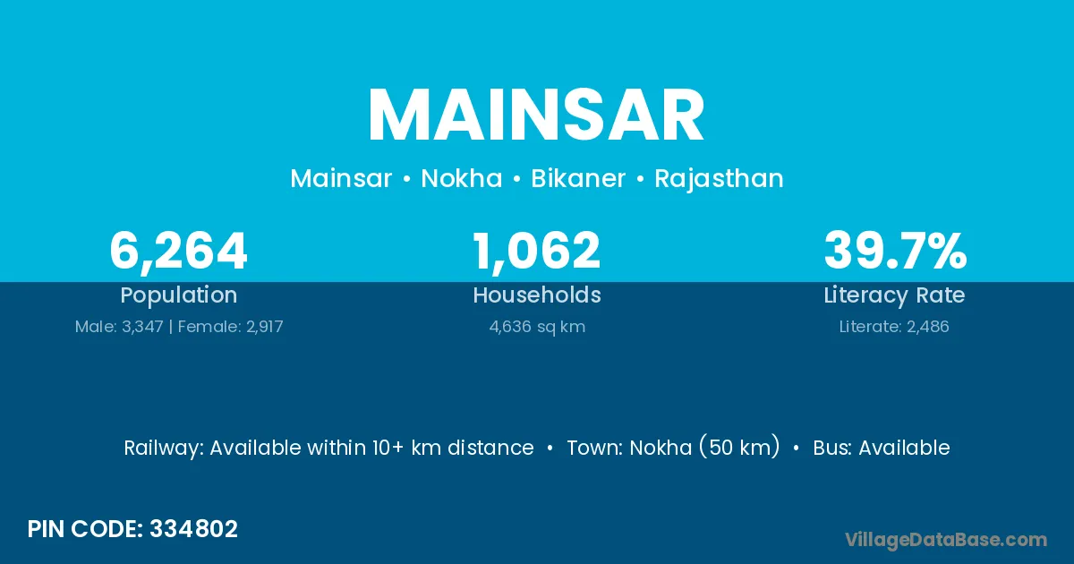 Nokha (50 km) is the nearest town to Mainsar village for major economic activities and is located approximately 50 km away.