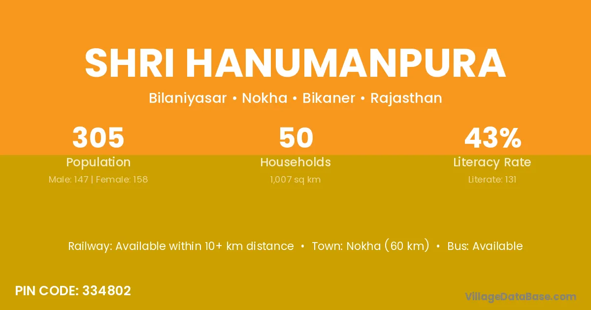 Shri Hanumanpura village has a total population of 305 people, of which 147 are males and 158 are females.