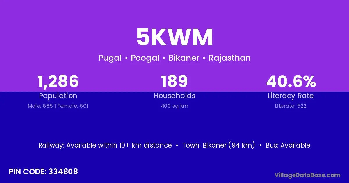 Bikaner (94 km) is the nearest town to 5kwm village for major economic activities and is located approximately 94 km away.