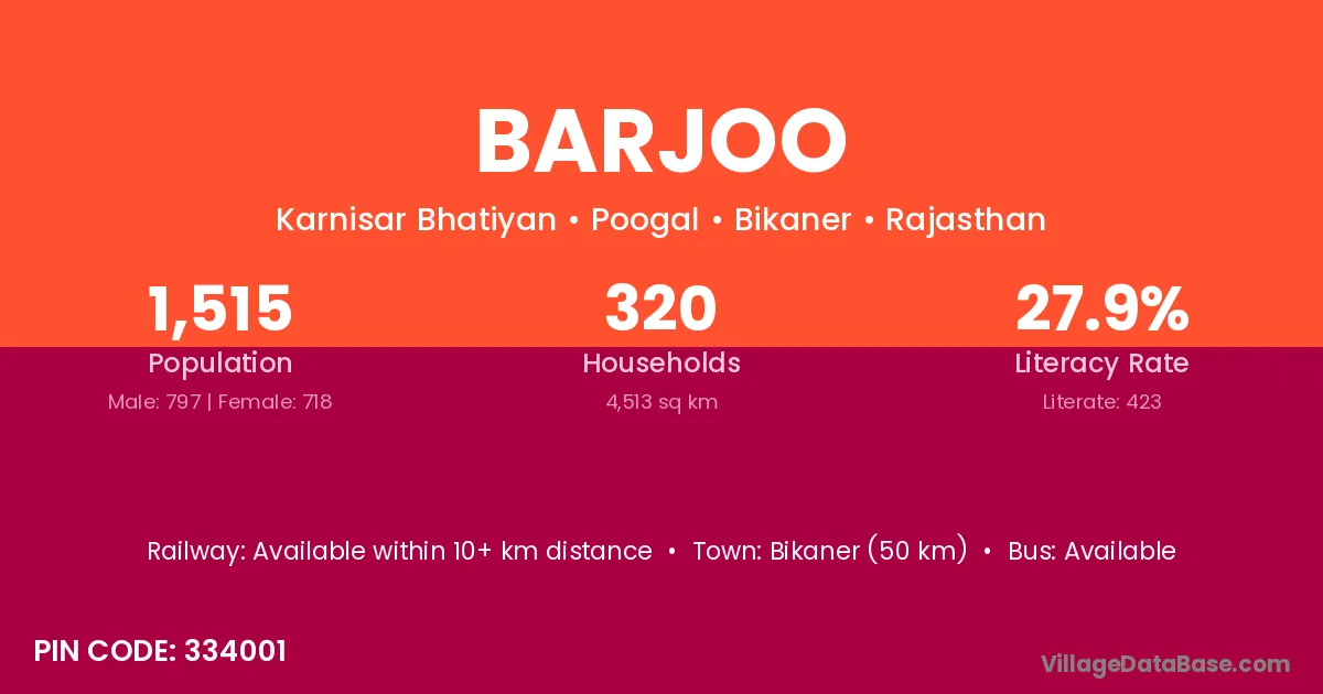 Bikaner (50 km) is the nearest town to Barjoo village for major economic activities and is located approximately 50 km away.