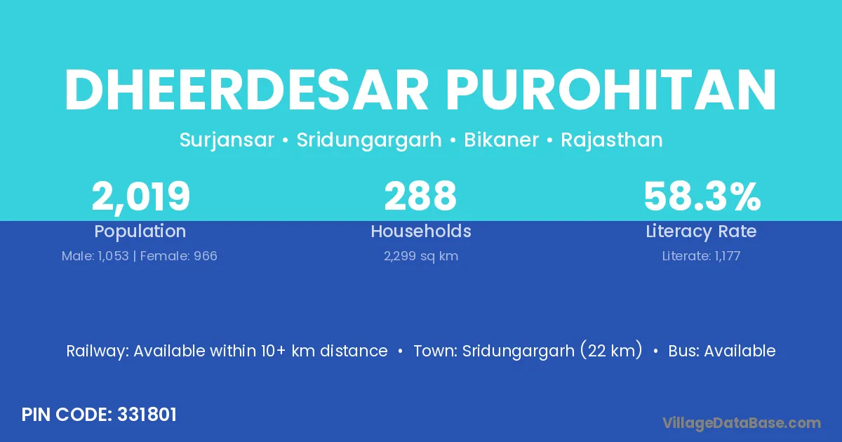 Sridungargarh (22 km) is the nearest town to Dheerdesar Purohitan village for major economic activities and is located approximately 22 km away.