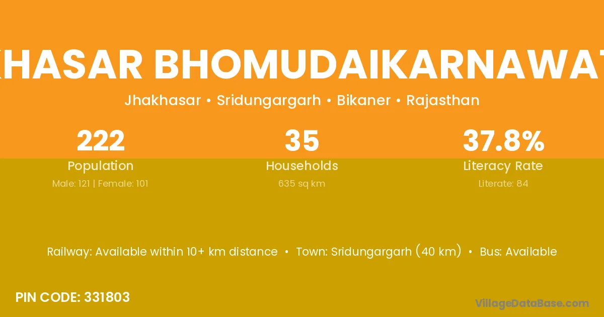 Jakhasar Bhomudaikarnawatan village has a total population of 222 people, of which 121 are males and 101 are females.