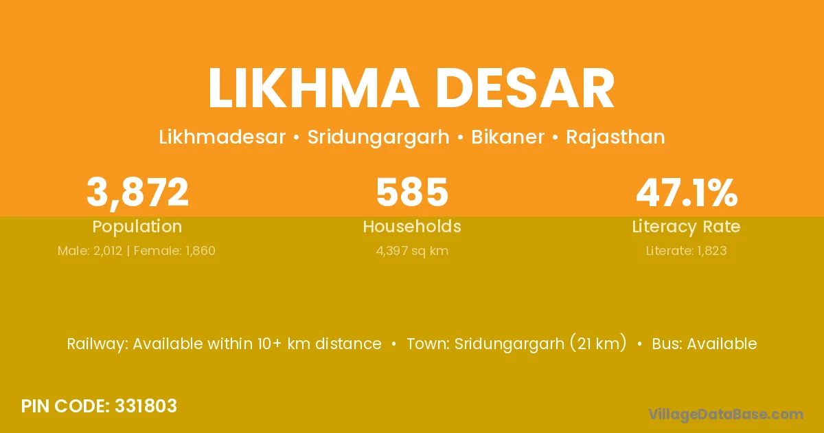 Sridungargarh (21 km) is the nearest town to Likhma Desar village for major economic activities and is located approximately 21 km away.