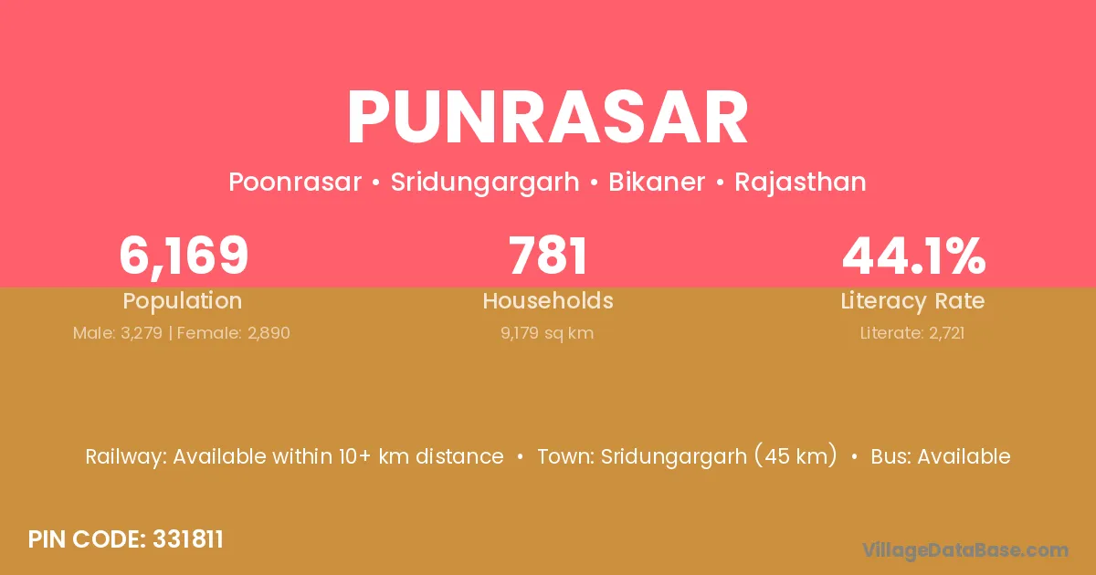 Sridungargarh (45 km) is the nearest town to Punrasar village for major economic activities and is located approximately 45 km away.
