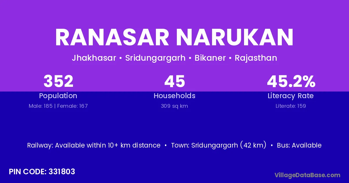 Sridungargarh (42 km) is the nearest town to Ranasar Narukan village for major economic activities and is located approximately 42 km away.