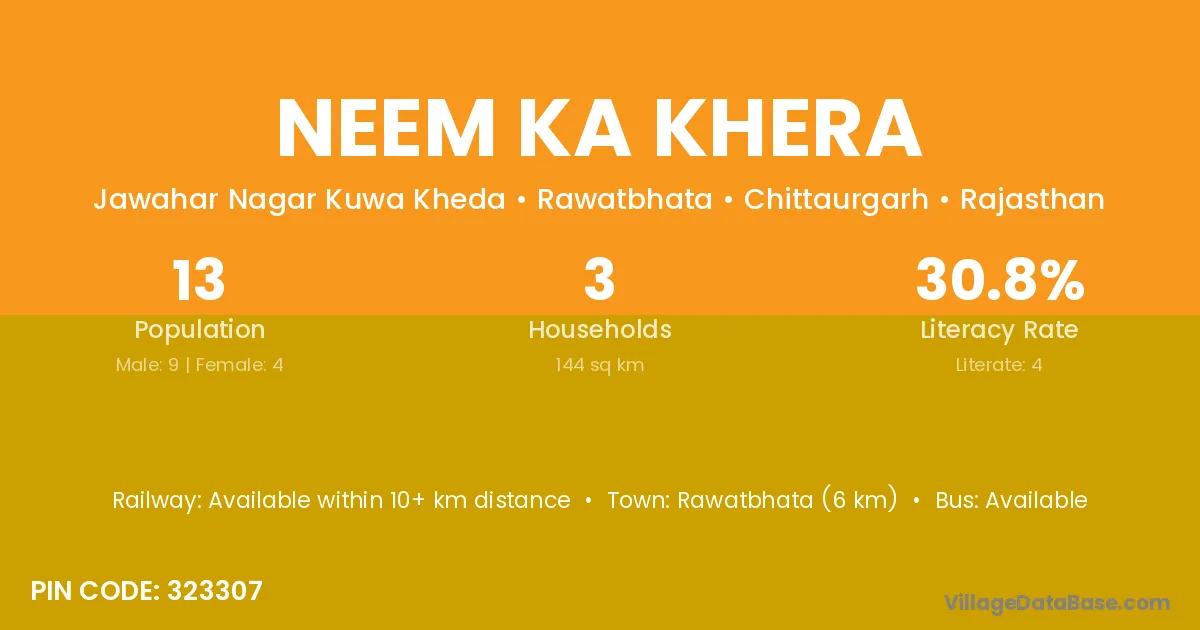 Bundi (21 km) is the nearest town to Neem Ka Khera village for major economic activities and is located approximately 21 km away.