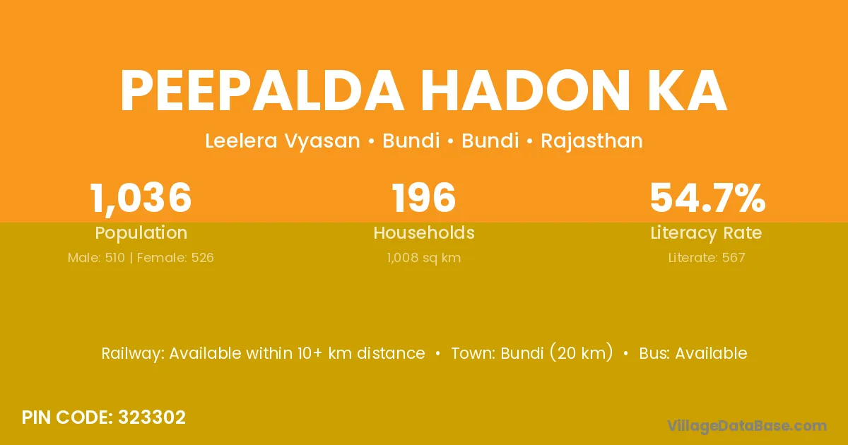 Peepalda Hadon Ka village has a total population of 1,036 people, of which 510 are males and 526 are females.