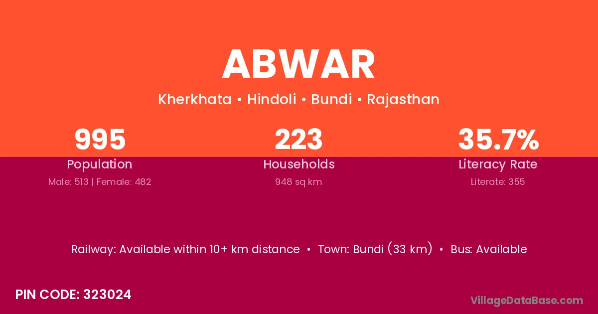Abwar village has a total population of 995 people, of which 513 are males and 482 are females.