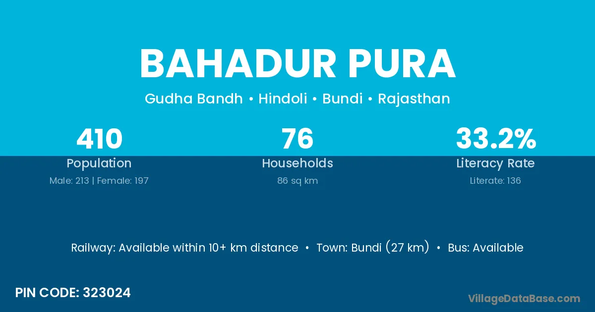 Bundi (27 km) is the nearest town to Bahadur Pura village for major economic activities and is located approximately 27 km away.