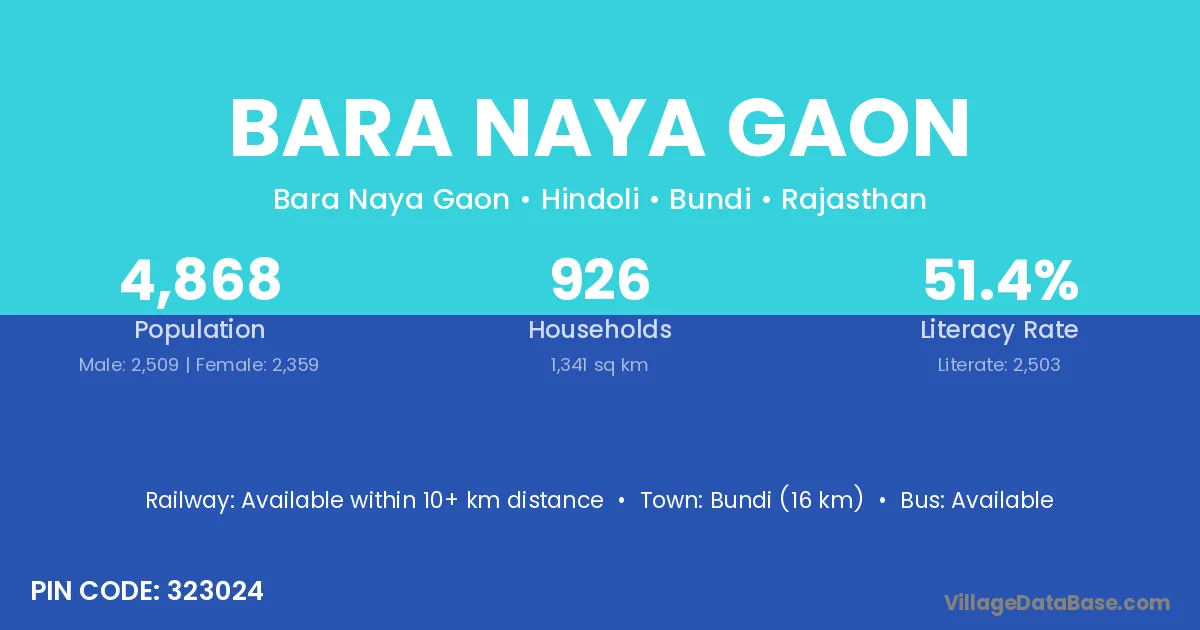 Bundi (16 km) is the nearest town to Bara Naya Gaon village for major economic activities and is located approximately 16 km away.