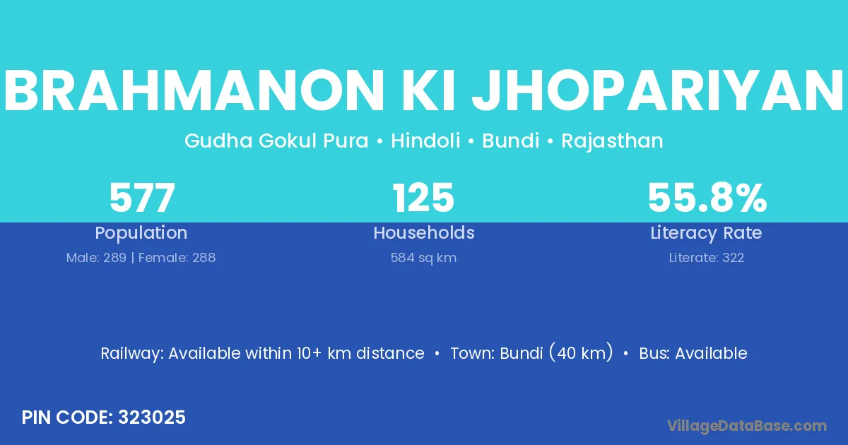 Brahmanon Ki Jhopariyan village has a total population of 577 people, of which 289 are males and 288 are females.