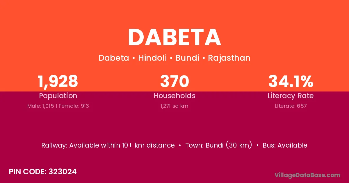 Dabeta village has a total population of 1,928 people, of which 1,015 are males and 913 are females.