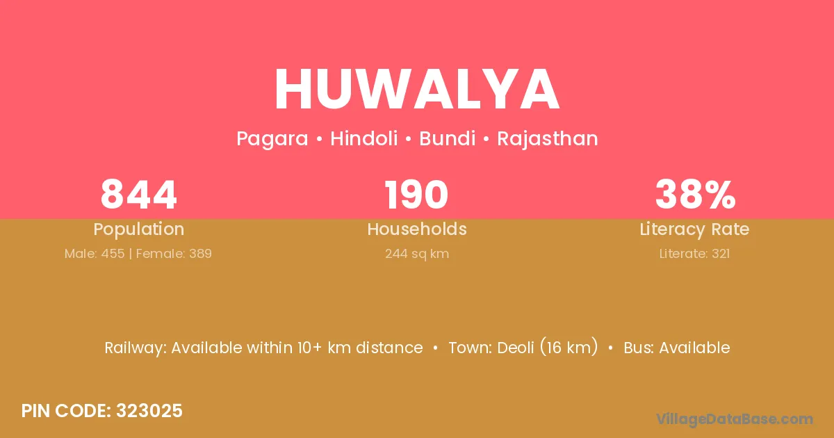 Deoli (16 km) is the nearest town to Huwalya village for major economic activities and is located approximately 16 km away.