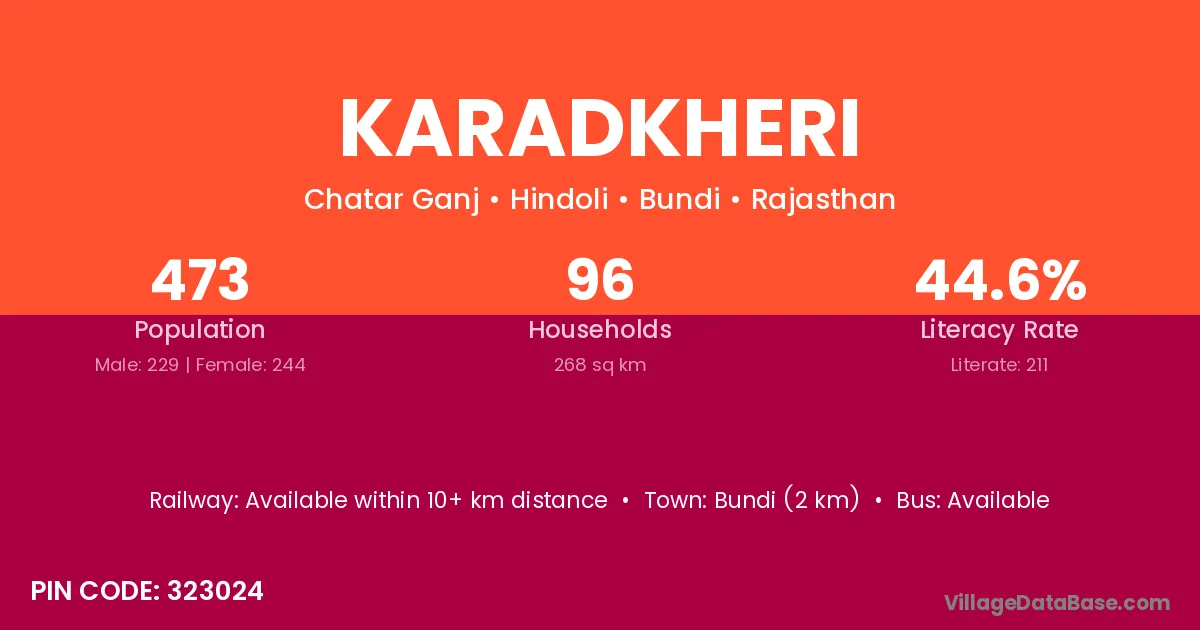 Bundi (2 km) is the nearest town to Karadkheri village for major economic activities and is located approximately 2 km away.