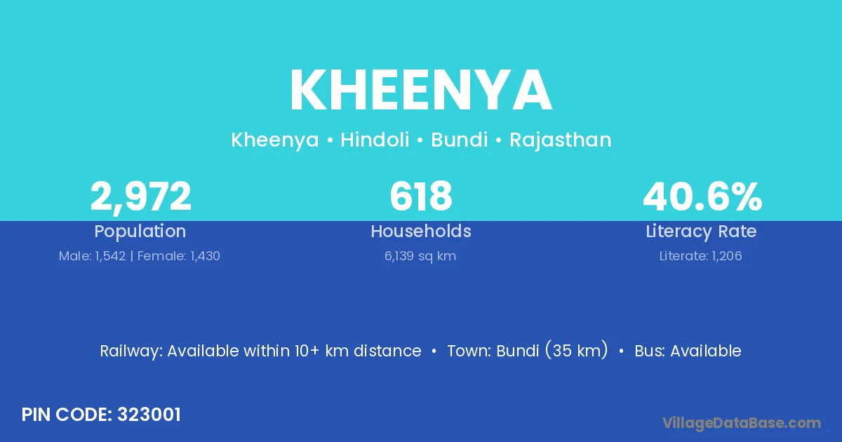 Bundi (35 km) is the nearest town to Kheenya village for major economic activities and is located approximately 35 km away.
