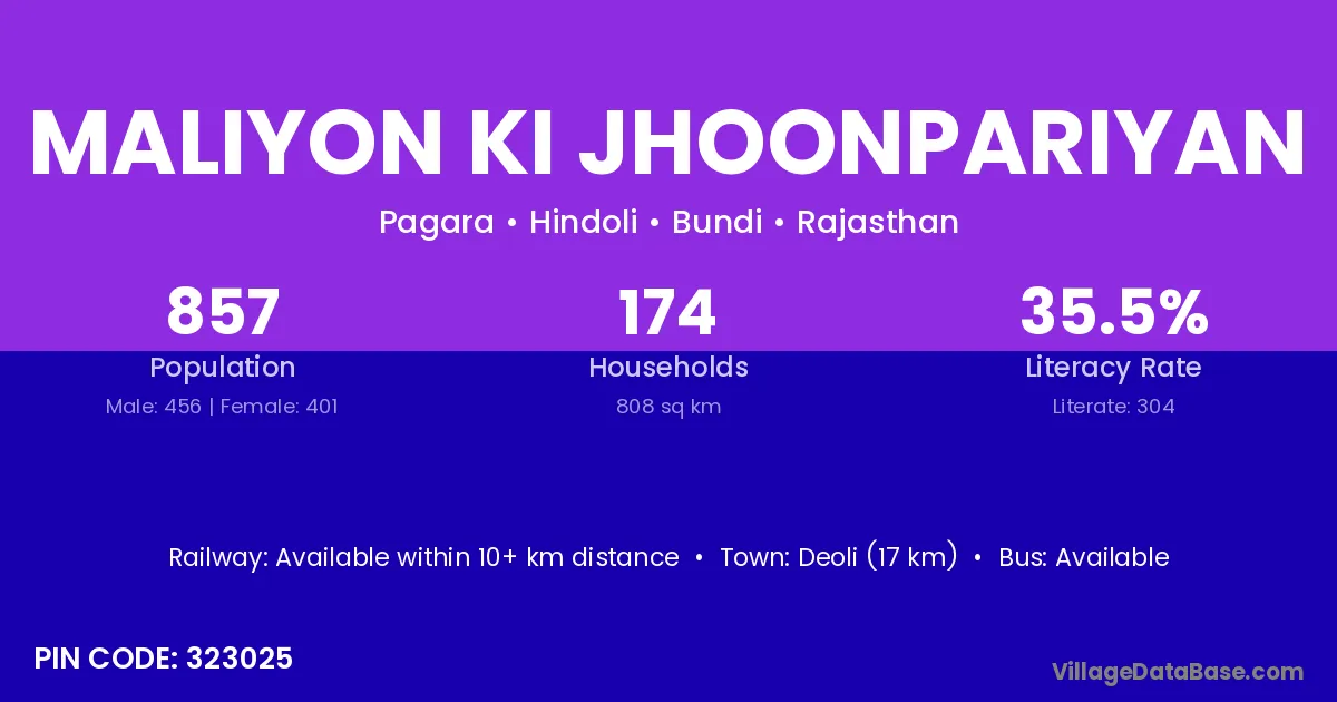 Maliyon Ki Jhoonpariyan village has a total population of 857 people, of which 456 are males and 401 are females.