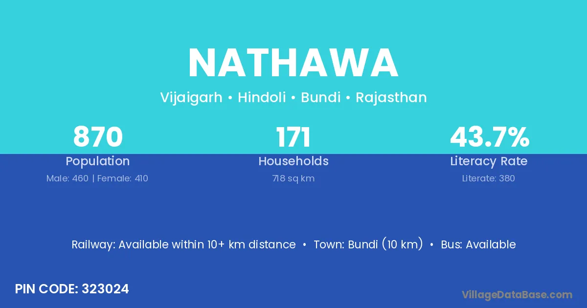 Bundi (10 km) is the nearest town to Nathawa village for major economic activities and is located approximately 10 km away.