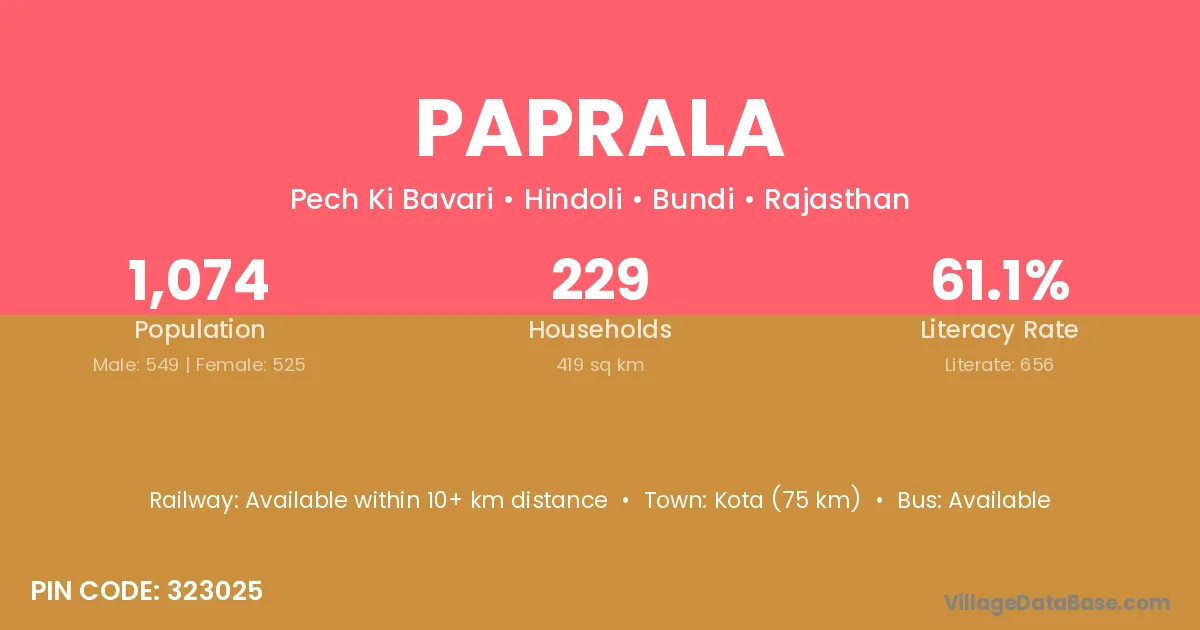Kota (75 km) is the nearest town to Paprala village for major economic activities and is located approximately 75 km away.
