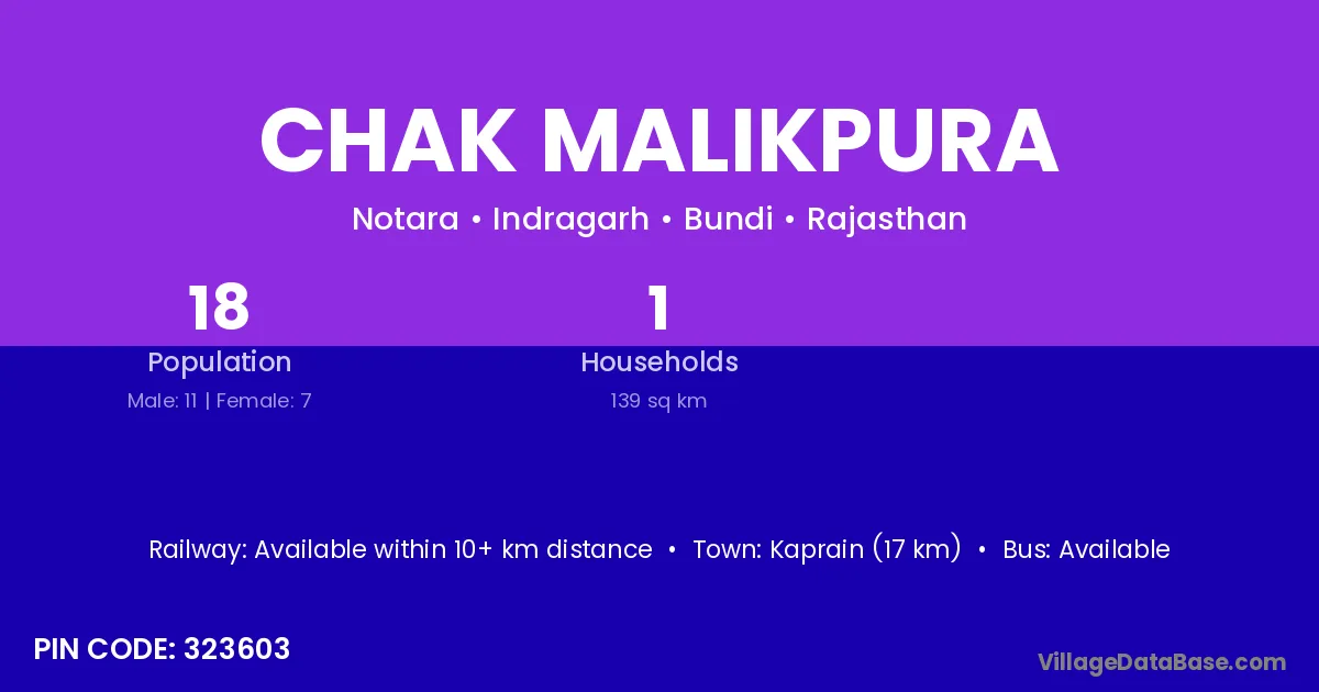 Chak Malikpura village has a total population of 18 people, of which 11 are males and 7 are females.