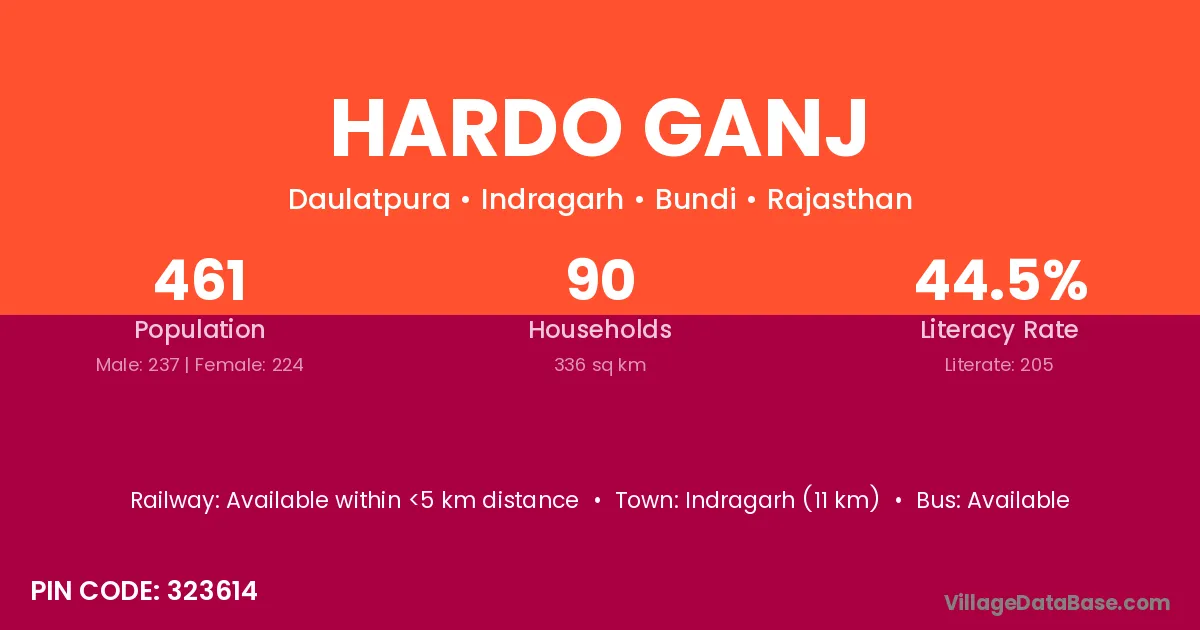 Indragarh (11 km) is the nearest town to Hardo Ganj village for major economic activities and is located approximately 11 km away.