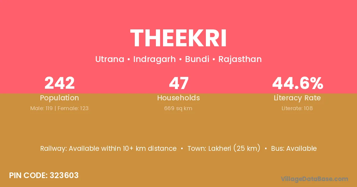 Lakheri (25 km) is the nearest town to Theekri village for major economic activities and is located approximately 25 km away.