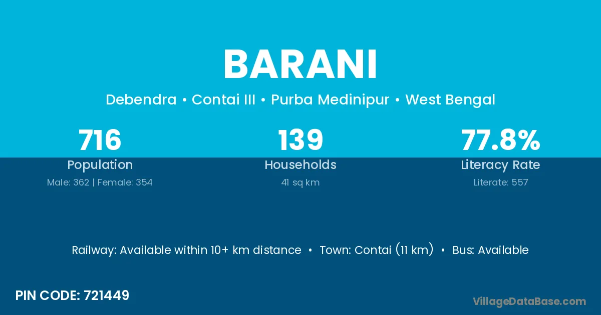 Keshoraipatan (33 km) is the nearest town to Barani village for major economic activities and is located approximately 33 km away.