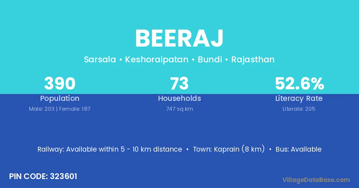 Kaprain (8 km) is the nearest town to Beeraj village for major economic activities and is located approximately 8 km away.