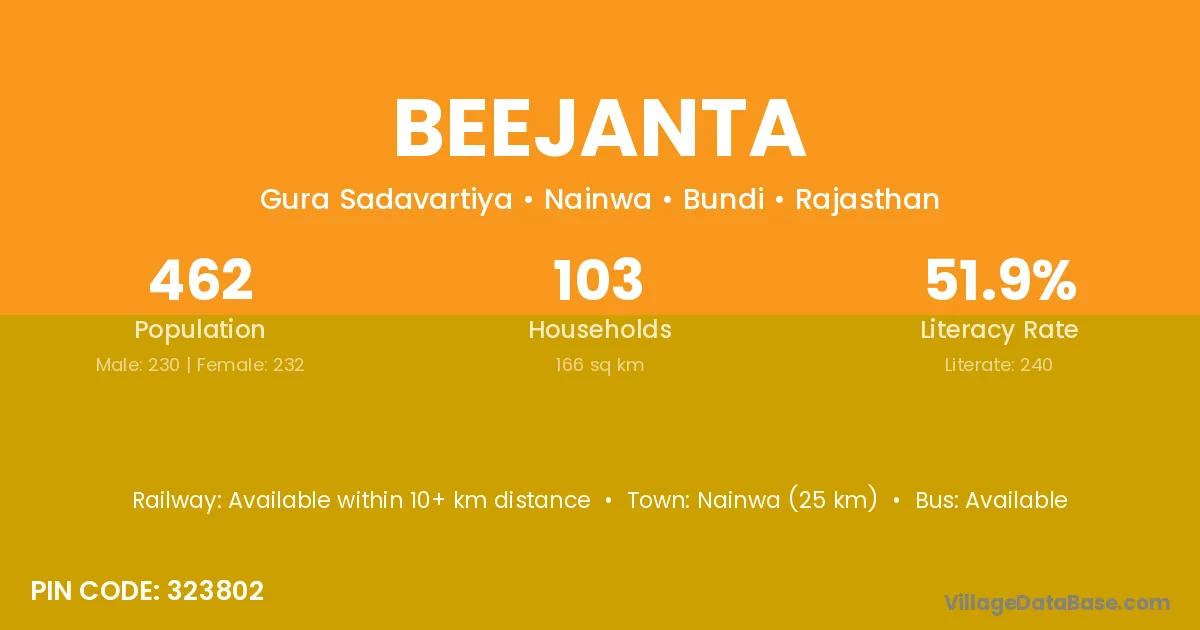 Beejanta village has a total population of 462 people, of which 230 are males and 232 are females.