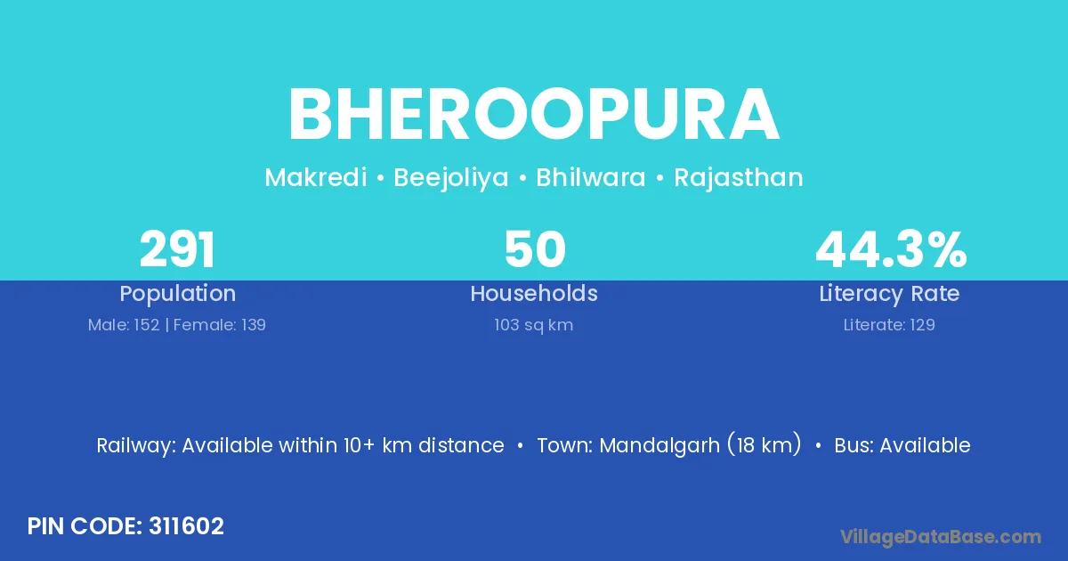 Nainwa (14 km) is the nearest town to Bheroopura village for major economic activities and is located approximately 14 km away.