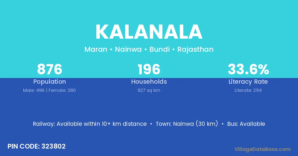 Nainwa (30 km) is the nearest town to Kalanala village for major economic activities and is located approximately 30 km away.
