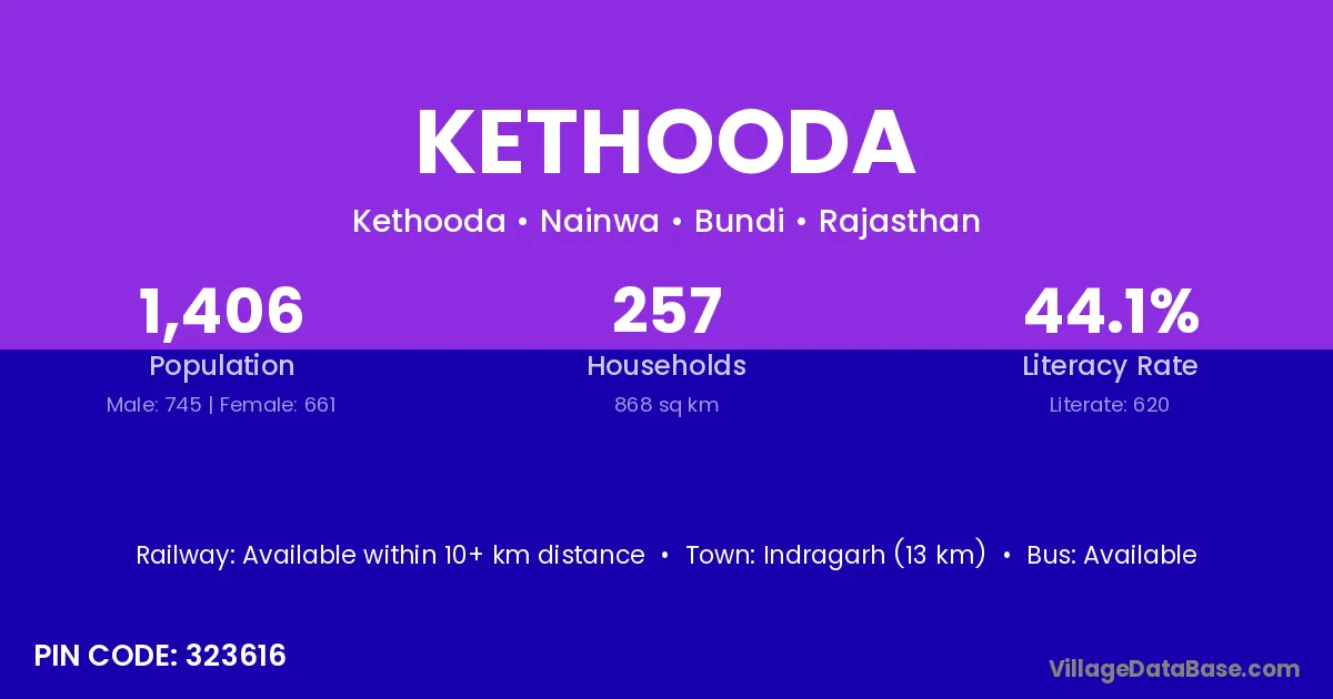 Indragarh (13 km) is the nearest town to Kethooda village for major economic activities and is located approximately 13 km away.