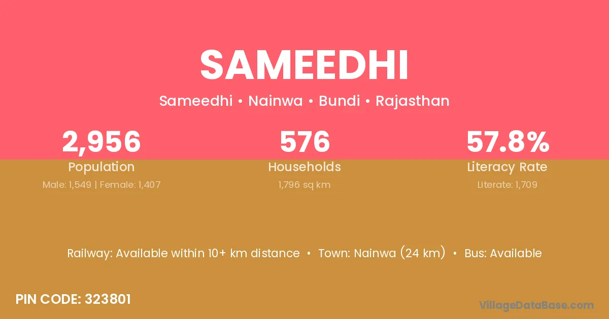 Nainwa (24 km) is the nearest town to Sameedhi village for major economic activities and is located approximately 24 km away.