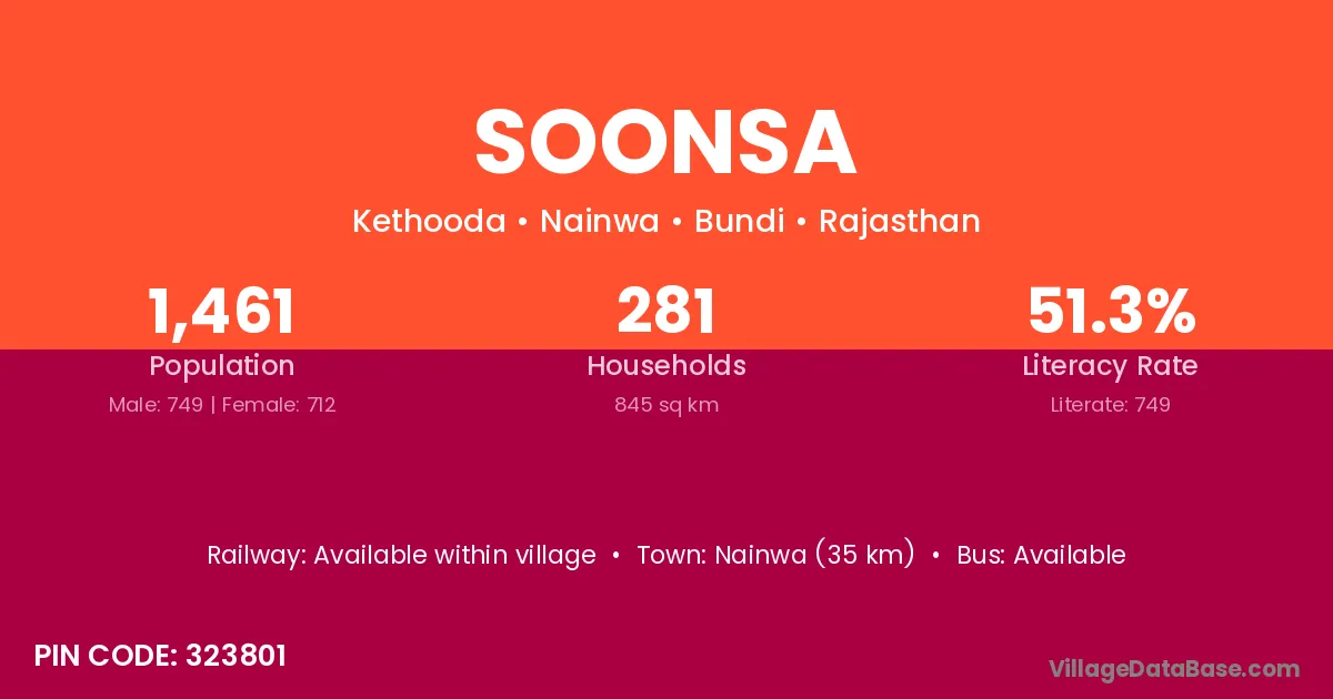 Nainwa (35 km) is the nearest town to Soonsa village for major economic activities and is located approximately 35 km away.