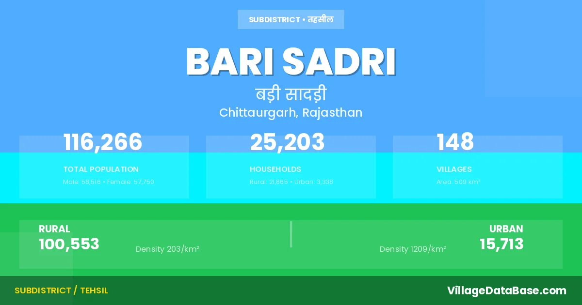 According to the 2011 census The total area of Bari Sadri Tehsil is 509 km², with a population of 116266 people. The population density is 229 inhabitants per square kilometre, and there are approximately 25203 houses in the sub district.