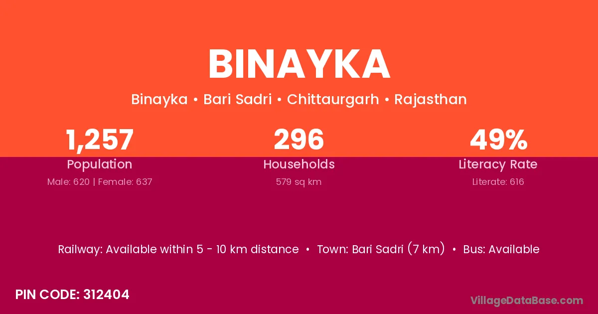 Bari Sadri (7 km) is the nearest town to Binayka village for major economic activities and is located approximately 7 km away.
