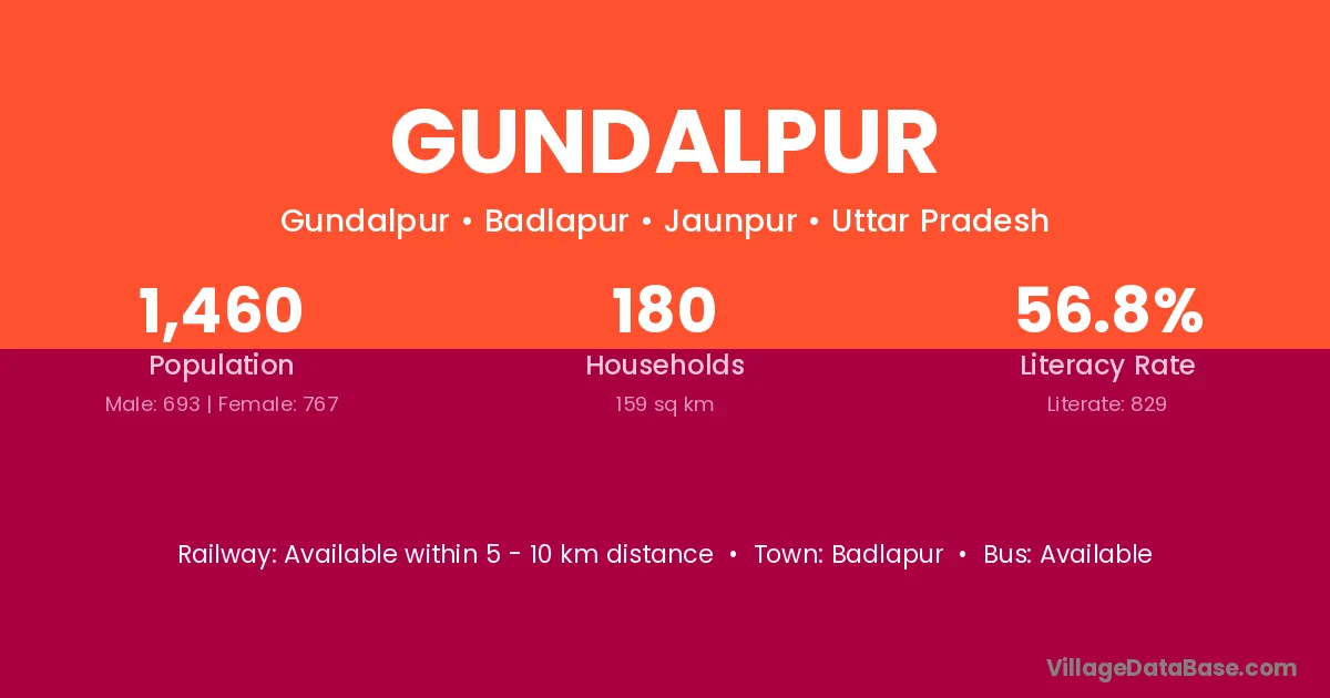 The literacy rate of Gundalpur village is 40.49%. Male literacy stands at 53.36% and female literacy at 27.77%.