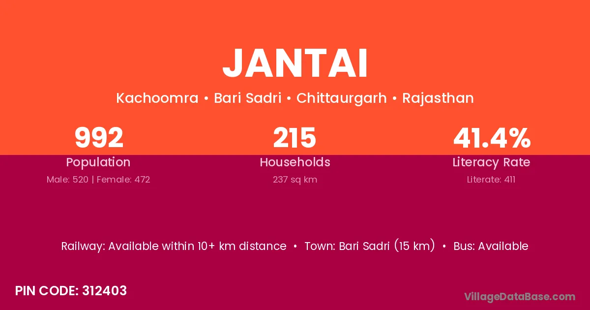 Bari Sadri (15 km) is the nearest town to Jantai village for major economic activities and is located approximately 15 km away.